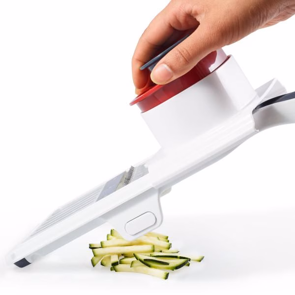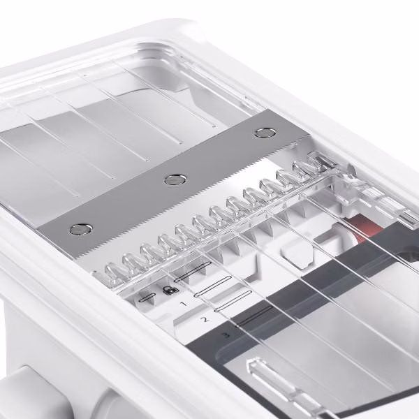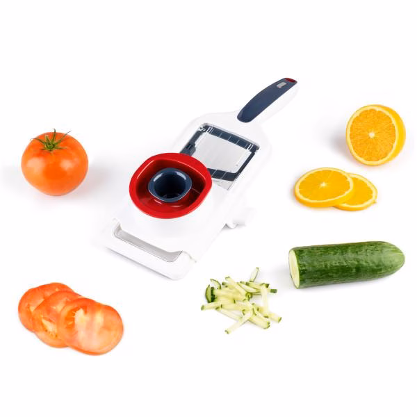 Kvaliteetne sakiline roostevabast terasest tera teeb kiiresti ja lihtsalt täiesti ühtlased viilud ja julienne-ribad*. Liuguri peal olev nupp võimaldab viilutamise paksuse hõlpsat reguleerimist. Lülitage nupuvajutusega üle julienne* terale. Lai viilutuspind mahutab suuremaid tooteid. Ergonoomiline käepide ja libisemiskindlad jalad hõlbustavad kasutamist. Nõudepesumasinas pestav